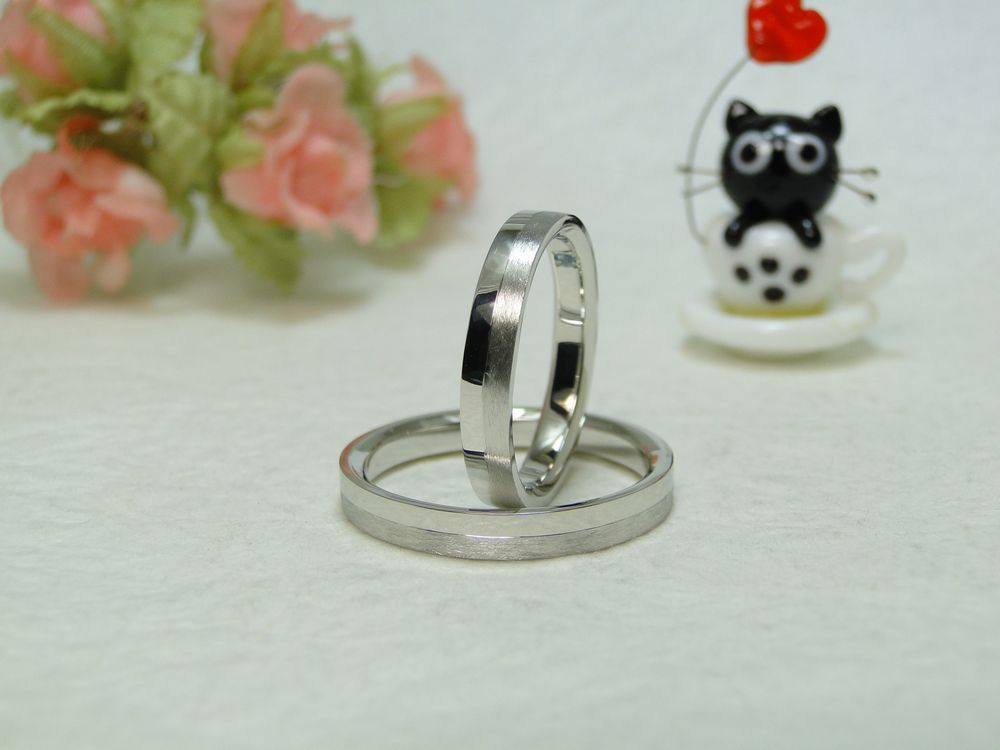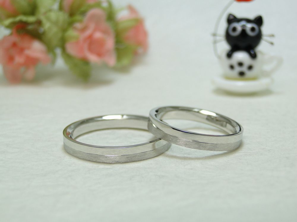 おふたりが作られたのは、ストレート平打ちで、幅の半分が艶消しされた素敵なデザインの結婚指輪です。