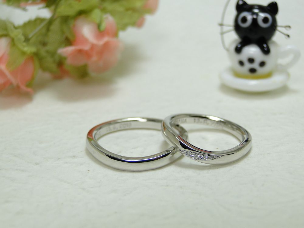 おふたりが作られたのは、細めでトップ部分がゆるくカーブして、女性用はダイヤが3つやや斜めに留まったデザインの結婚指輪です。