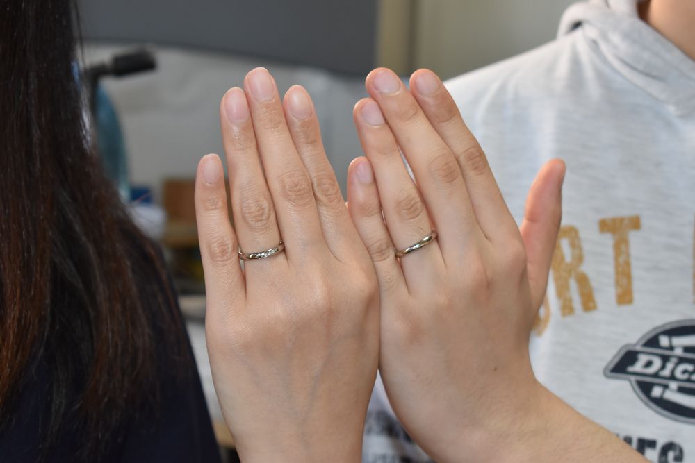 おふたりが作られたのは、シンプルなストレート甲丸のリングで、女性用にはダイヤが3つ彫留めされています。
