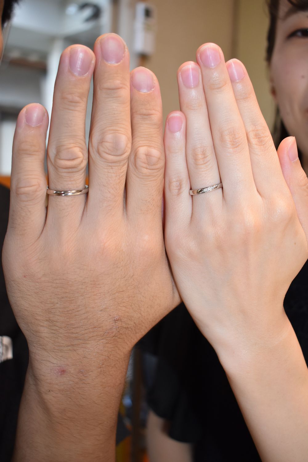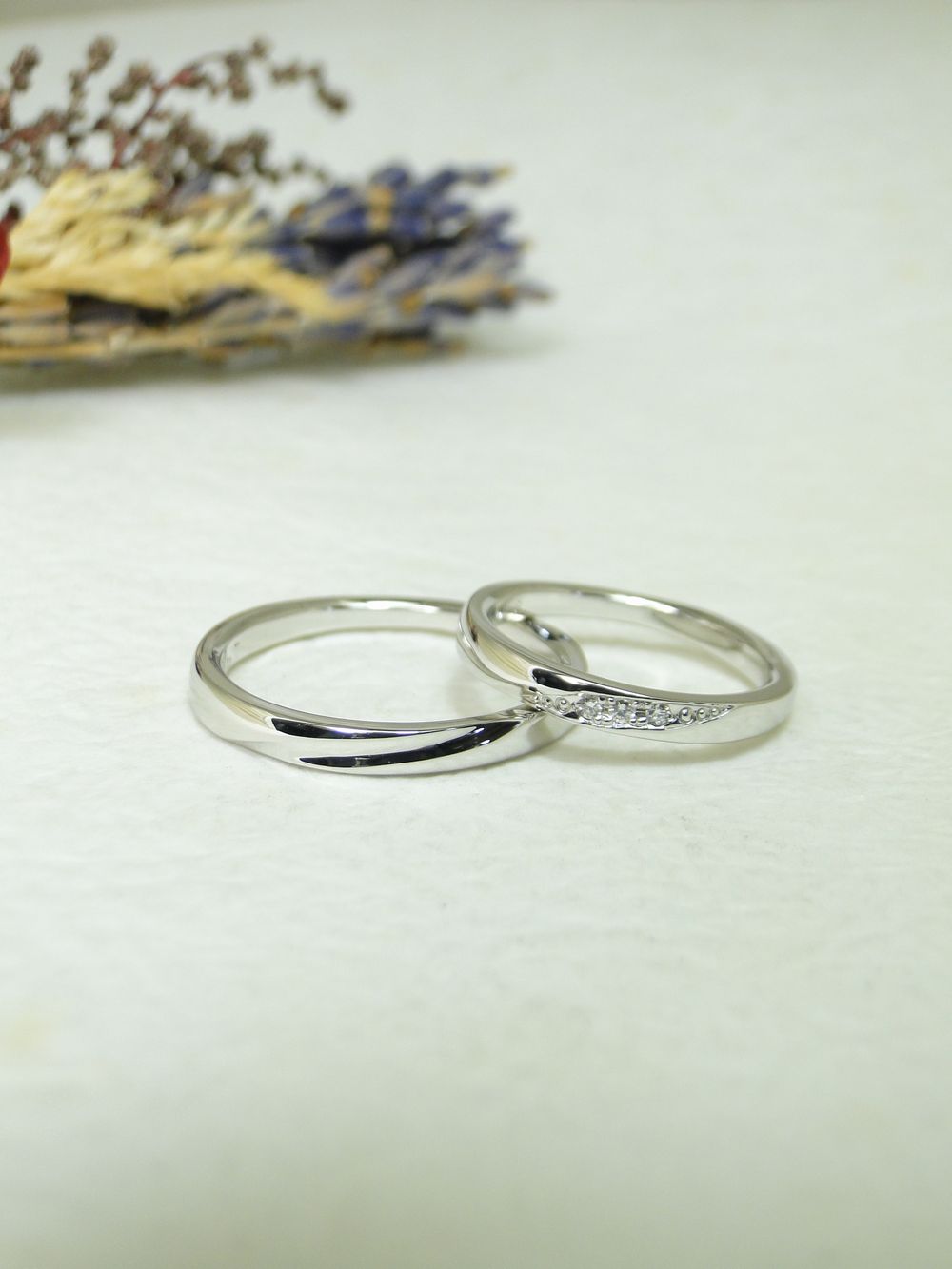 おふたりが作られたのは、ストレート平甲丸に斜めラインの入った結婚指輪です。