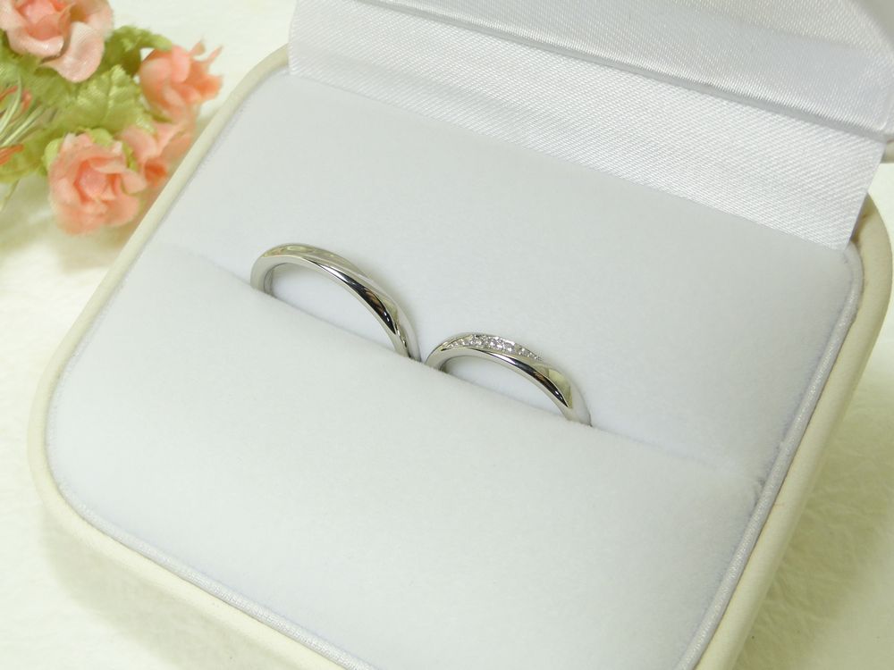 女性用にはそのラインにダイヤが3つ留まっています。 素材はプラチナ。