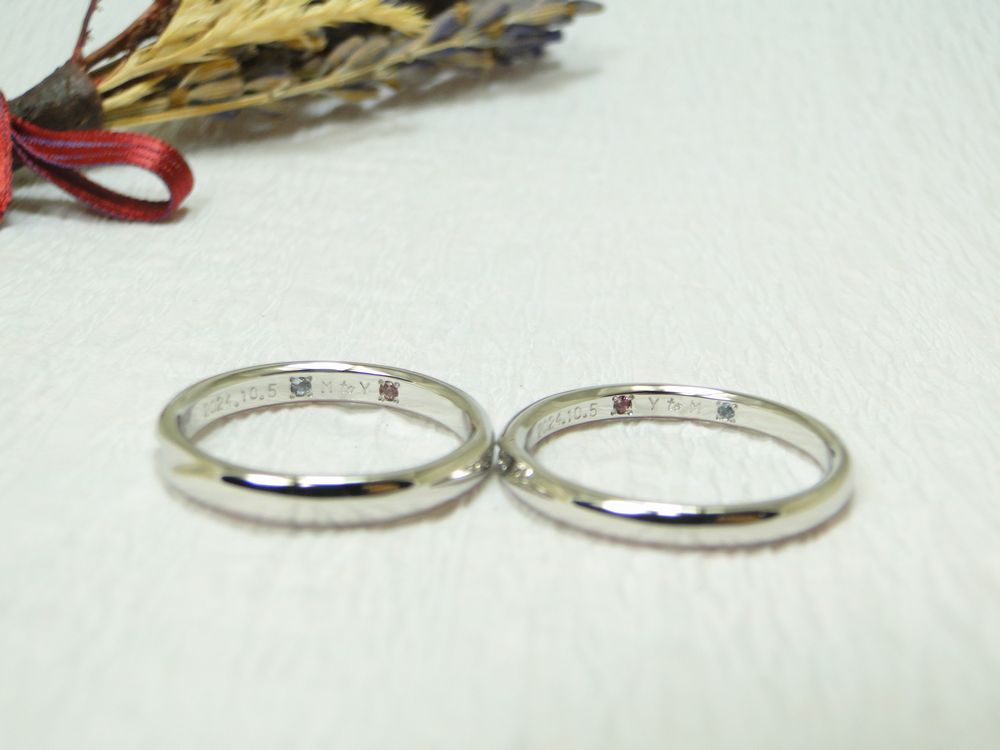 内側にはおふたりのイニシャルの横に誕生石。